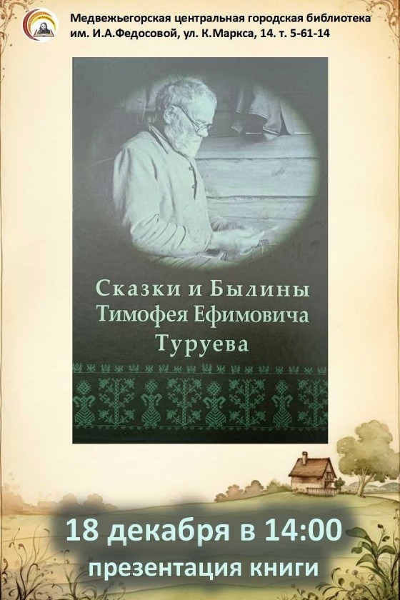 Дорогие жители и гости нашего города! Приглашаем вас в Медвежьегорскую центральную городскую библиотеку им.М.А.Федосовой на презентацию уникальной книги "Сказки и былины Тимофея Ефимовича Туруева" 18 декабря в 14:00 по адресу: ул.К.Маркса, д.14.