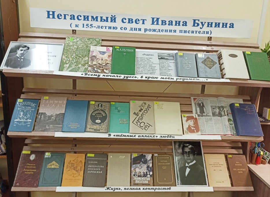 На абонементе библиотечно-социального отдела (ул.Лесная,4) открылась книжная выставка «Негасимый свет Ивана Бунина», посвященная 155-летию со дня рождения писателя.