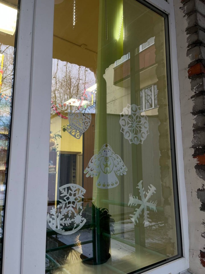 Светлана Лушина (вырезками из бумаги украшены библиотечные окна),