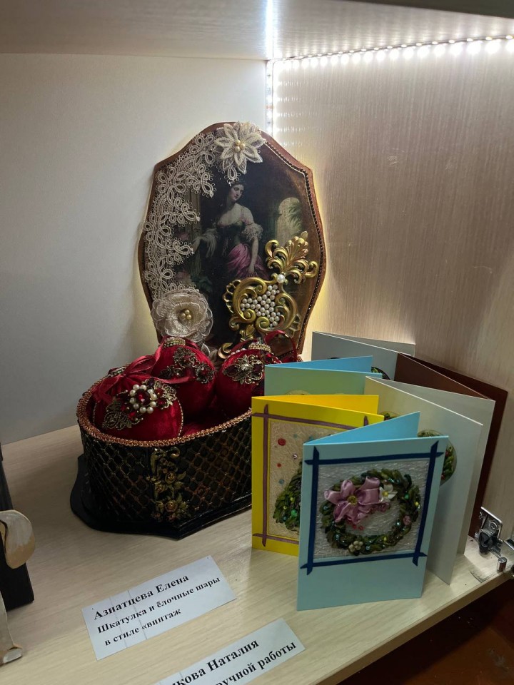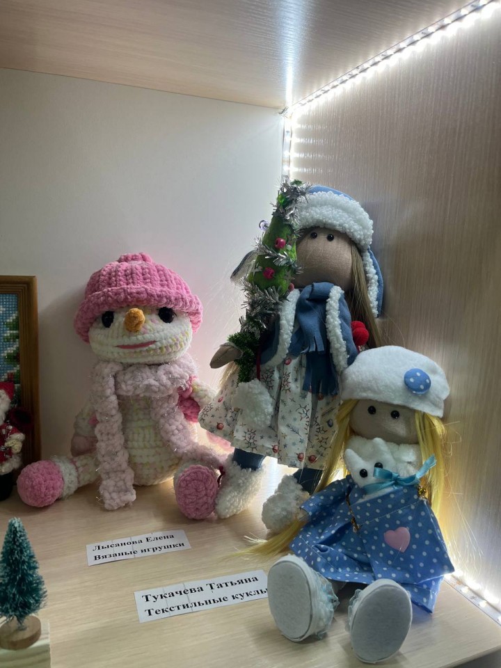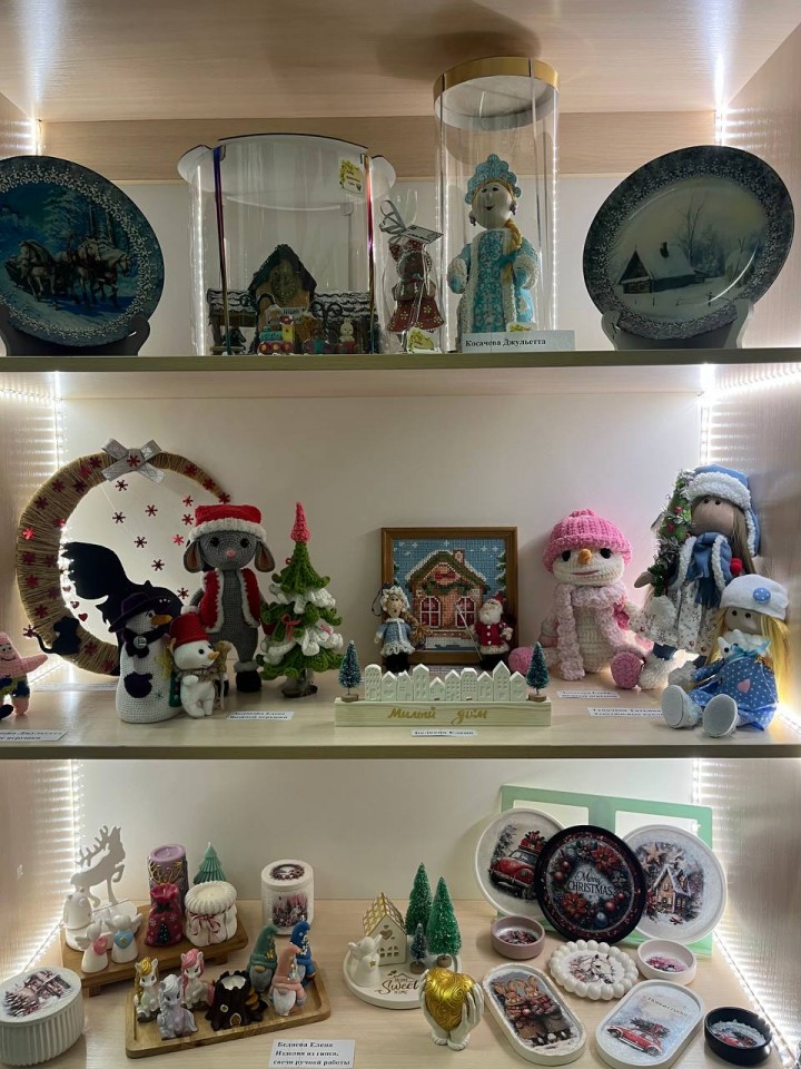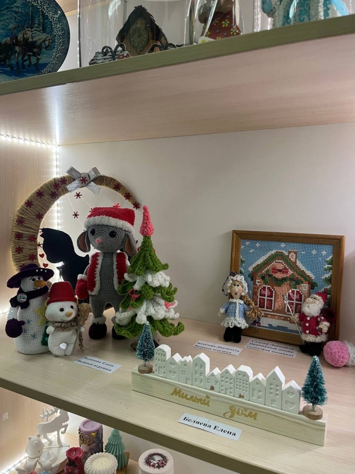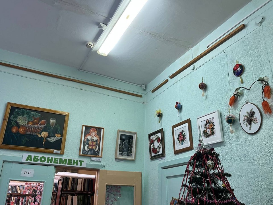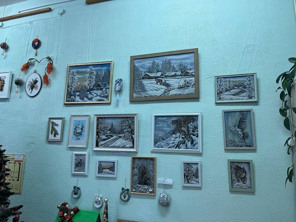 На выставке представлены очень красивые работы, требующие кропотливого труда, терпения и таланта, посвящённые зиме, новогодним праздникам.