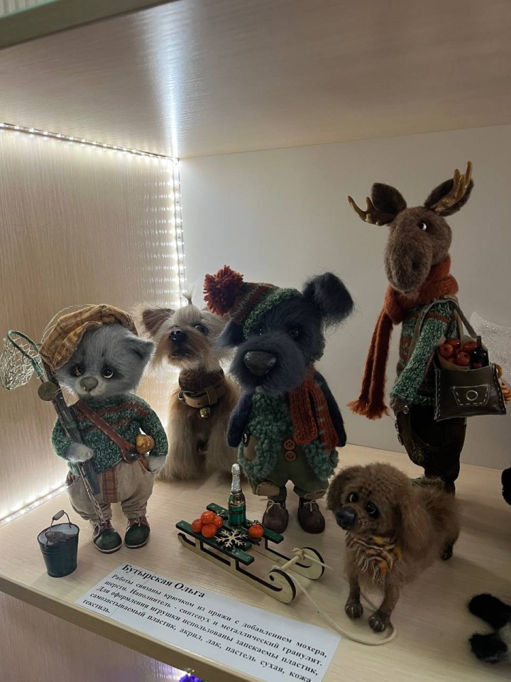 Ольга Бутырская (собака с санками, лось с новогодними подарками, кот-рыбак, такса, йоркшер. Эти работы связаны крючком из пряжи с добавлением мохера, шерсти. Наполнитель - синтепух и металлический гранулят. Для оформления игрушек использованы запекаемый пластик, самозастываемый пластик, акрил, лак, пастель сухая, кожа, текстиль),