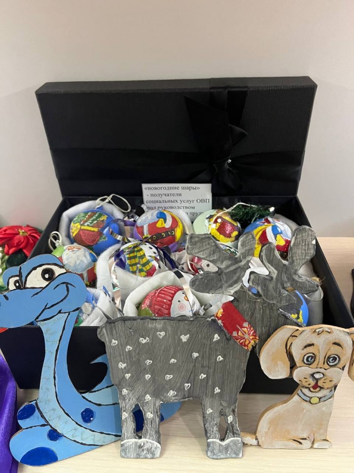 получатели социальных услуг отделения временного проживания (дер.Лумбуши), инструктор по труду Светлана Иванова (новогодние шары, работы «Сказочный домик», «Сапожок с ветками», «Над окошком месяц», «Совушки», деревянные игрушки),