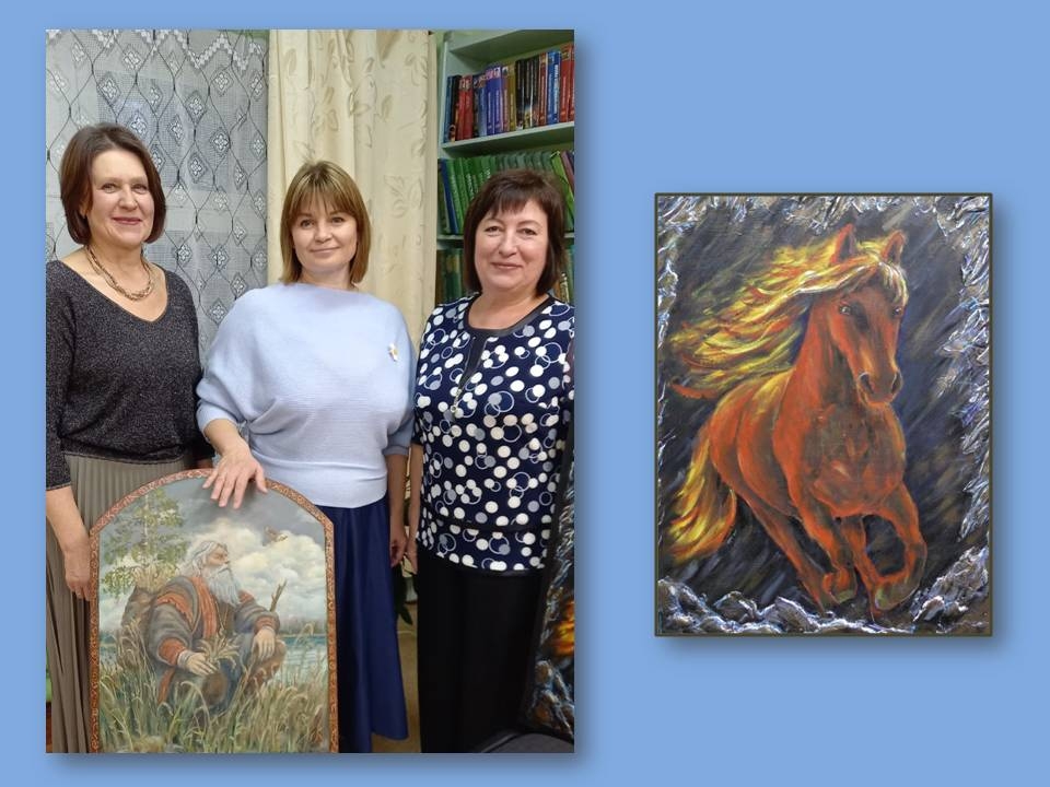 Ольга Васильевна представила две совершенно новые картины. Одна из них создана по рунам «Калевалы», а вторая посвящена символу 2026 года - огненной лошади. Мы стали первыми зрителями.