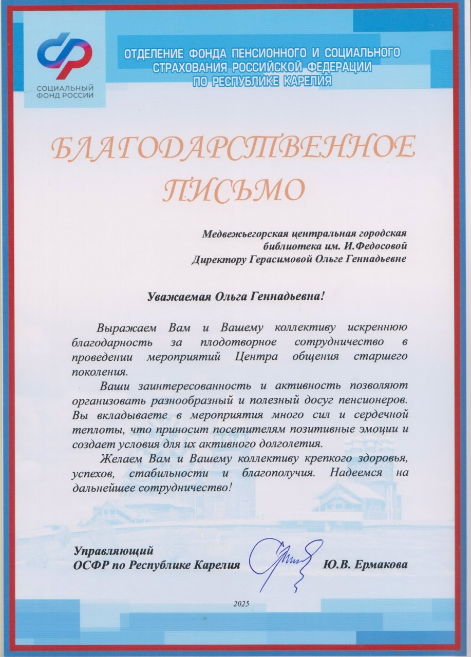 Сотрудниками Медвежьегорской центральной городской библиотеки им.И.А.Федосовой ведётся активная работа по организации и проведению мероприятий для Центра общения старшего поколения г.Медвежьегорска. 1 октября 2025 года на Фестивале Центров общения старшего поколения Карелии деятельность библиотеки была отмечена Благодарственным письмом. Благодарим за высокую оценку нашей работы.