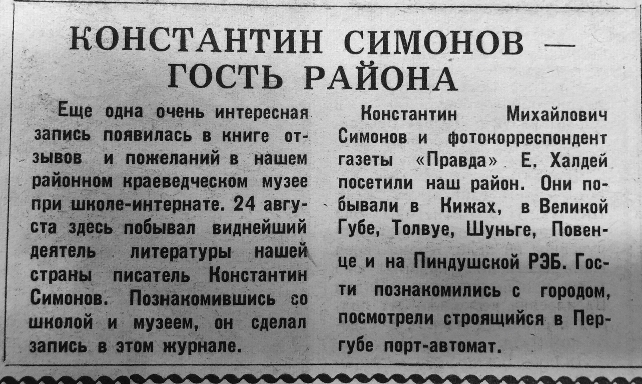 24 августа 1970 года Медвежьегорский район посетили фотокорреспондент газеты «Правда» Евгений Халдей и писатель Константин Симонов.